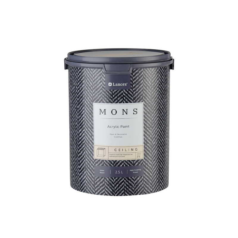 Готовое колерованное на производстве решение Mons Ceiling для потолков с приятным белым оттенком и минимальным блеском (2%). На основе модифицированного латекса она создаёт глубоко матовое, бархатистое покрытие с исключительной белизной и укрывистостью. Легко наносится, допускает влажную уборку и соответствует высоким стандартам безопасности и экологичности.