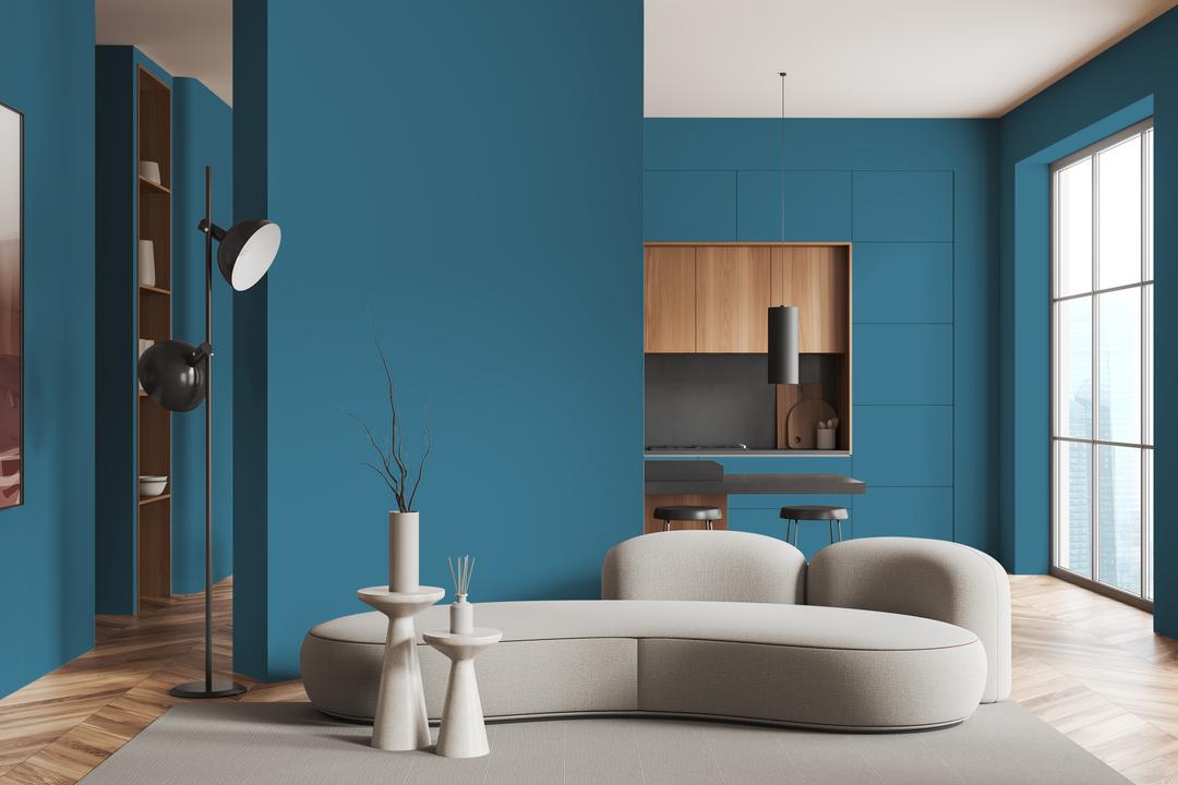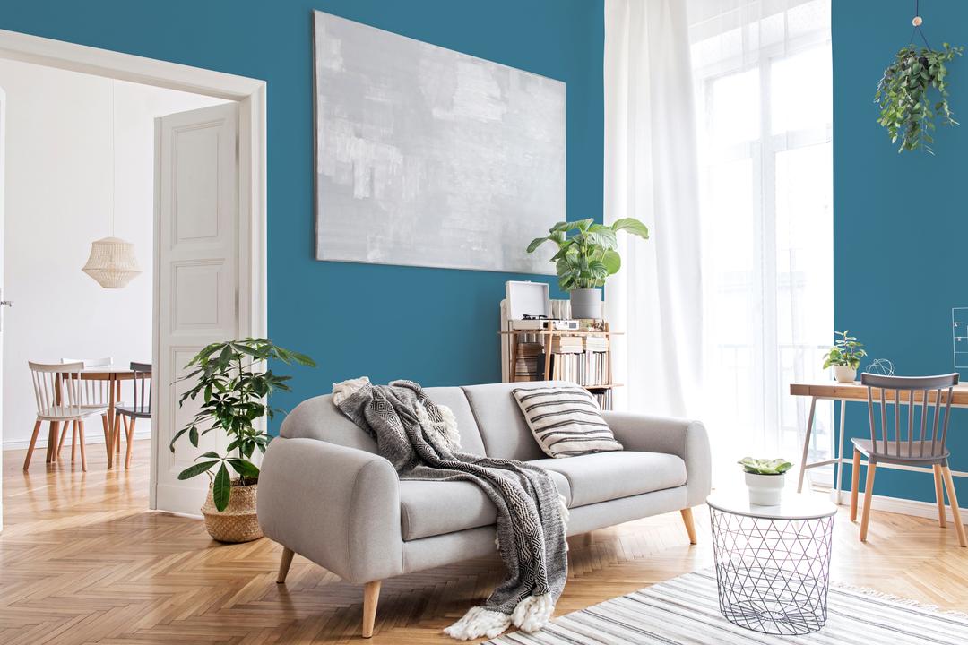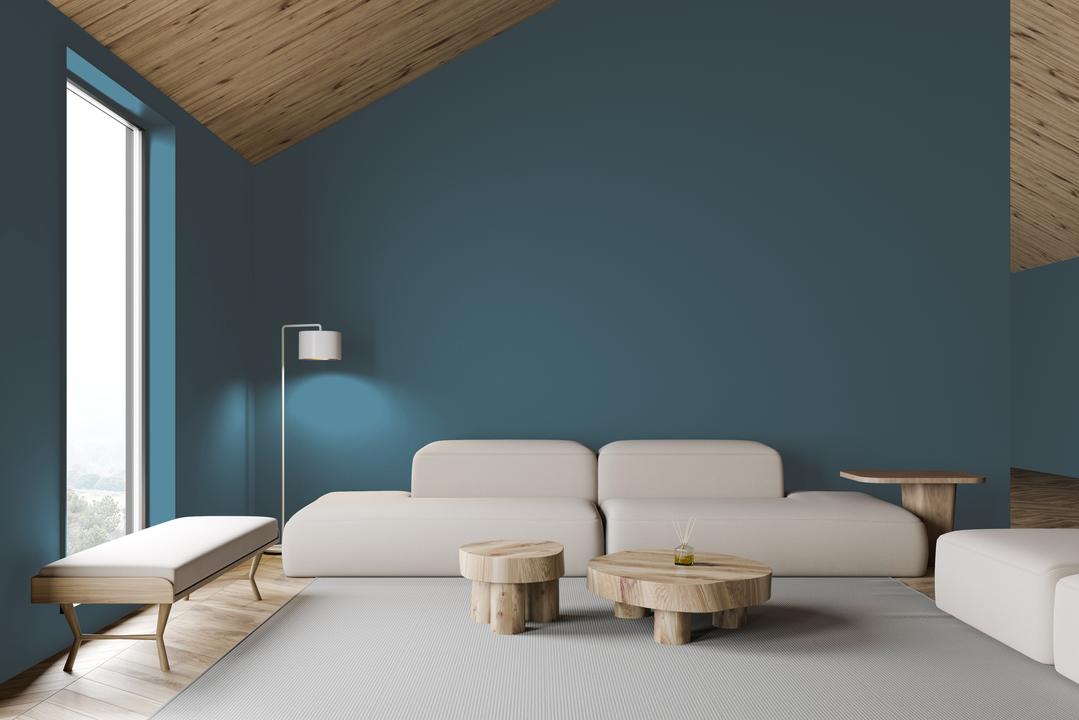 С чем сочетать? Сочетается с белым, бежевым, серым. Материалы — дерево, камень, металл. Акценты: коралл, охра.