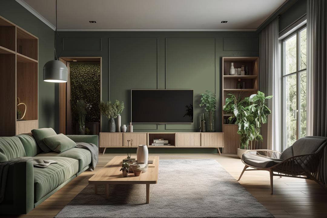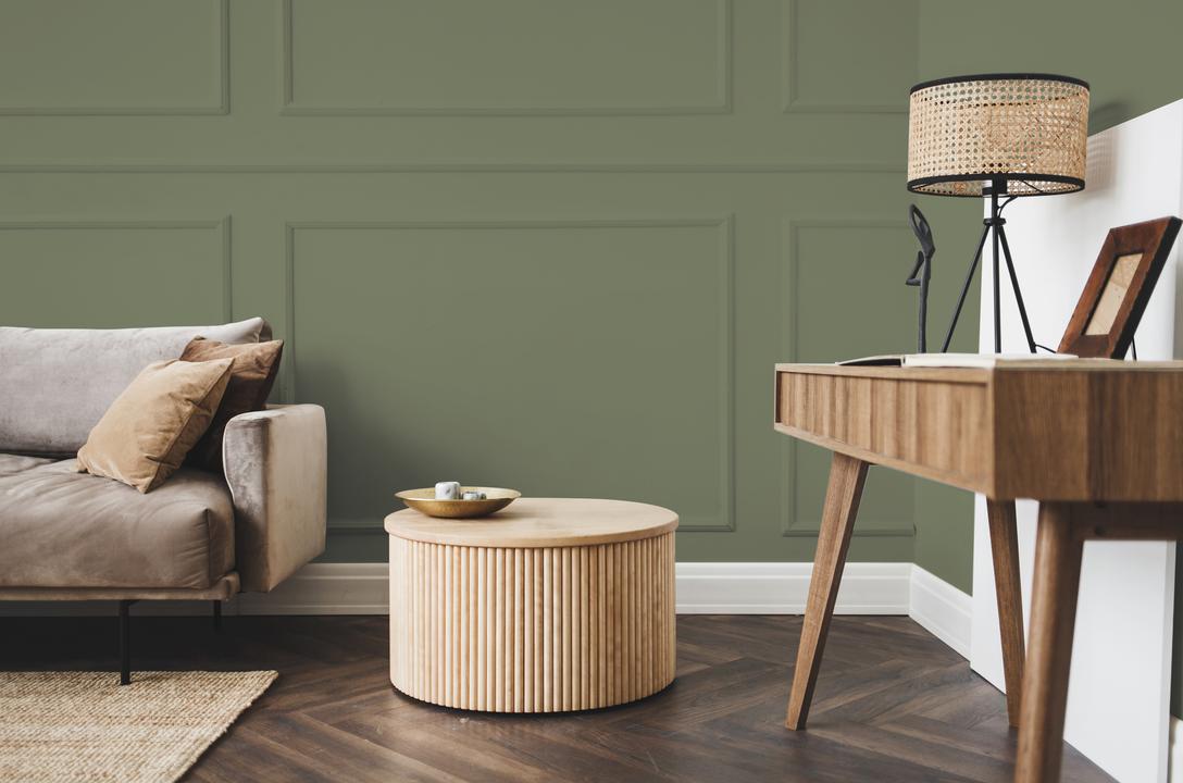 В интерьере этот цвет создает атмосферу природной элегантности. Он хорошо работает как основной фон или акцент. При разном освещении меняется от зеленого до серого.