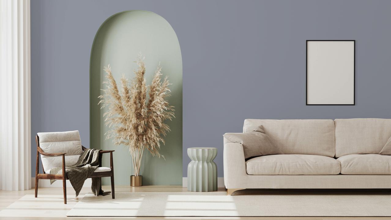 В интерьере этот цвет создает атмосферу уединения и покоя. Он хорошо работает как основной фон или акцент. При разном освещении меняется от серого до фиолетового.