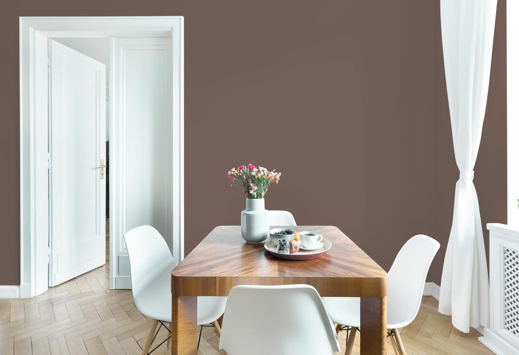 В интерьере этот цвет создает атмосферу камерности и тепла. Он отлично работает как акцент или основной фон в спальнях и гостиных. При разном освещении становится глубже.