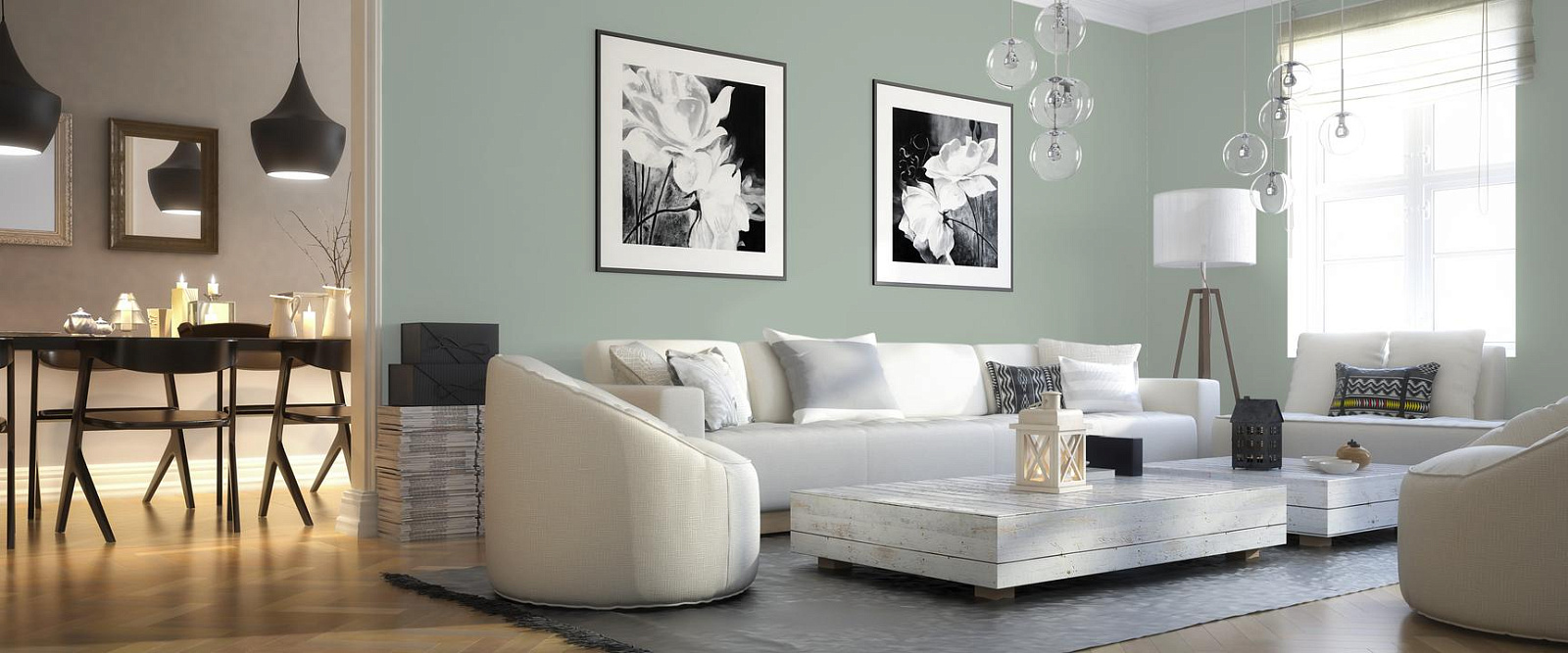 В интерьере этот цвет создает атмосферу уединения и связи с природой. Он хорошо работает как основной фон или акцент. При разном освещении меняется от зеленого до серого.