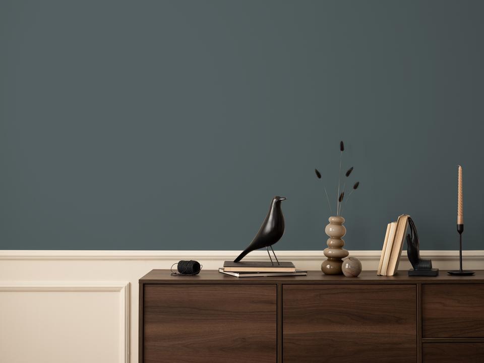 В интерьере этот цвет создает эффектный контраст и глубину. Лучше всего работает на акцентных стенах или в больших пространствах. При ярком свете раскрывается холодный синий подтон.