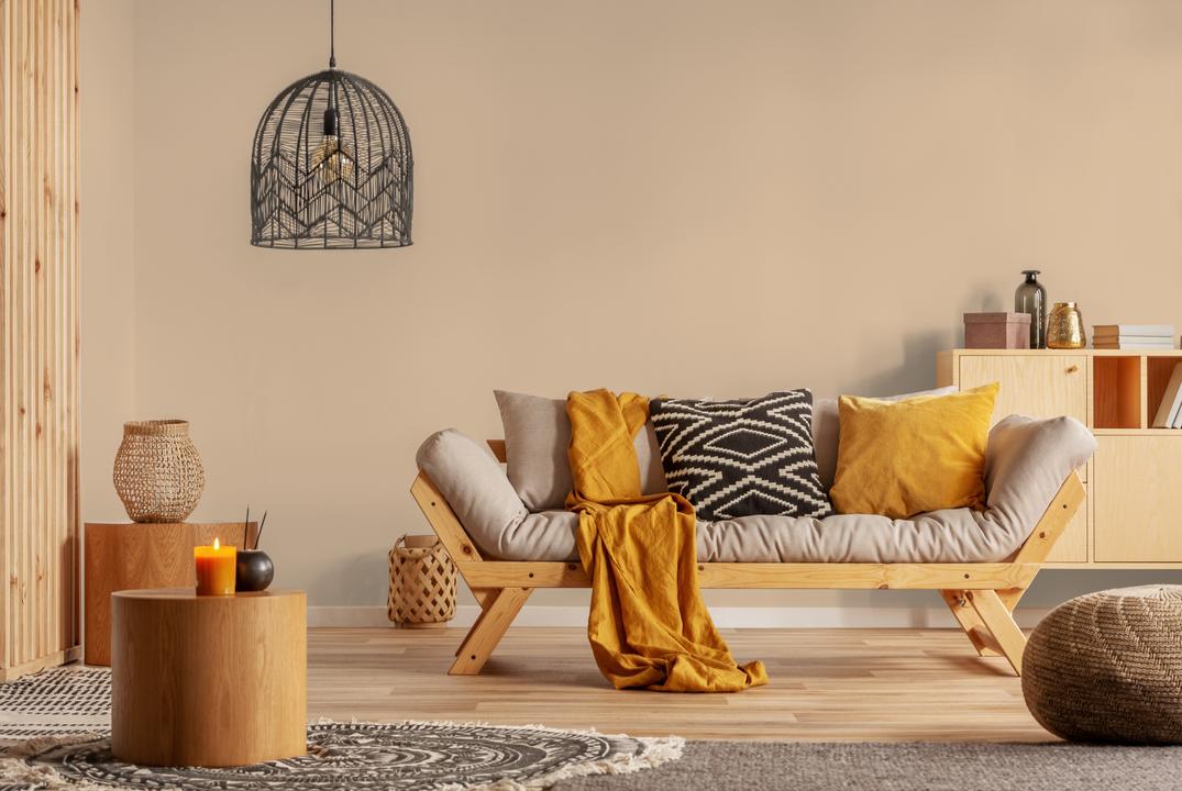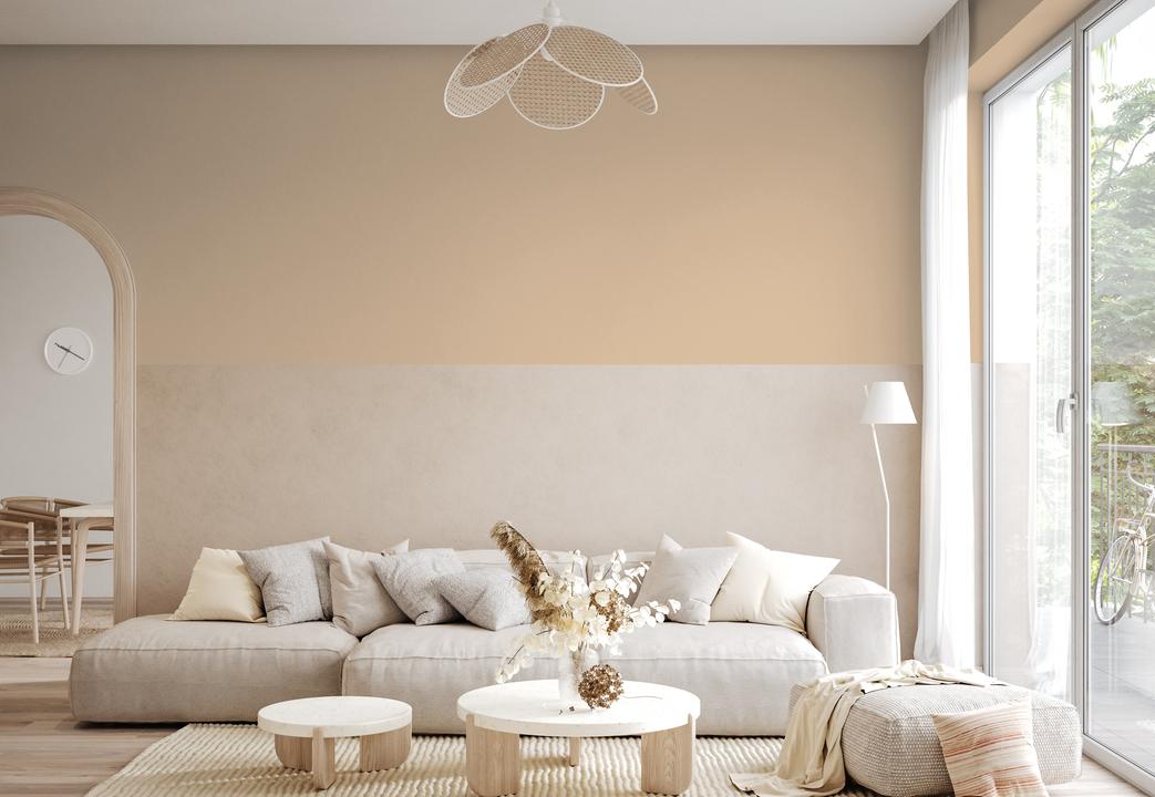 В интерьере этот цвет наполняет пространство теплом и спокойствием. Он отлично сочетается с натуральными материалами и зеленью. При разном освещении меняется от бежевого до золотистого.