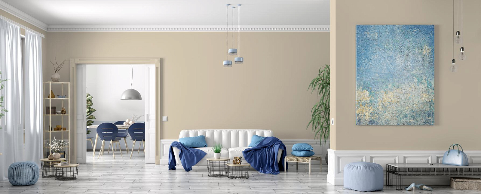 В интерьере этот цвет наполняет пространство солнечным теплом. Он отлично сочетается с морскими акцентами и деревом. При разном освещении меняется от бежевого до золотистого.