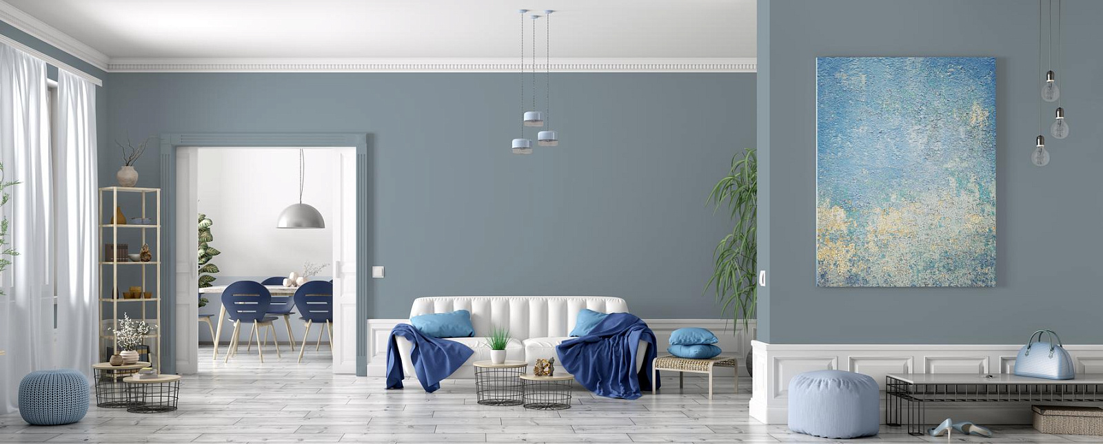 В интерьере этот цвет создает атмосферу сдержанной силы и уверенности. Он хорошо работает как основной фон или акцент. При разном освещении меняется от серого до синего.