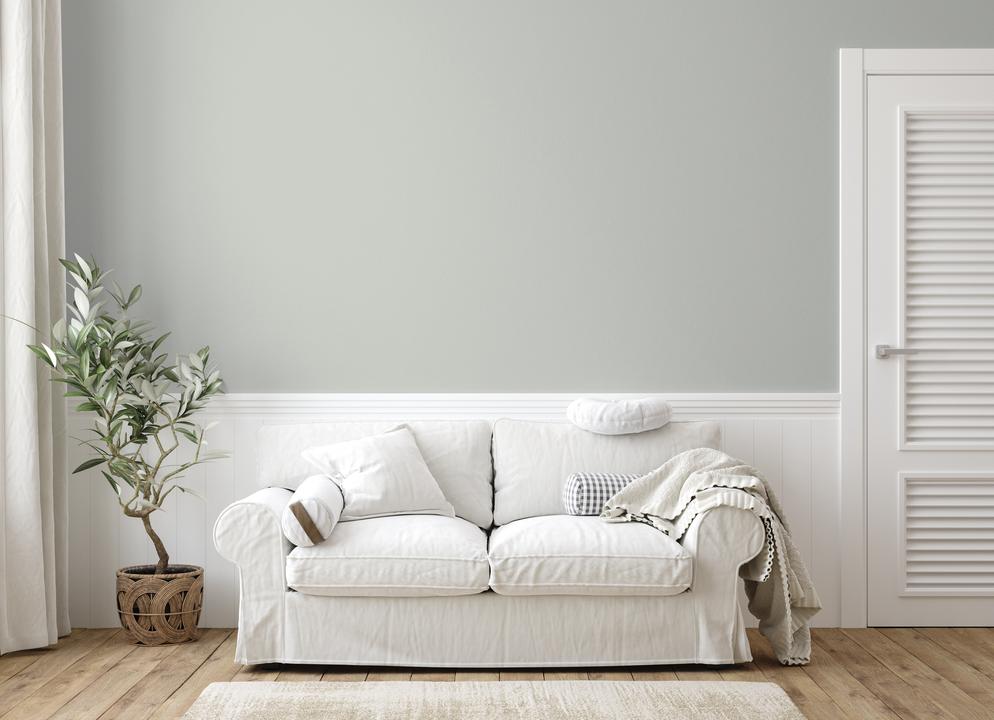 В интерьере этот цвет создает легкую, воздушную атмосферу. Он хорошо работает как база для более ярких акцентов. При разном освещении может отдавать легкой зеленью.